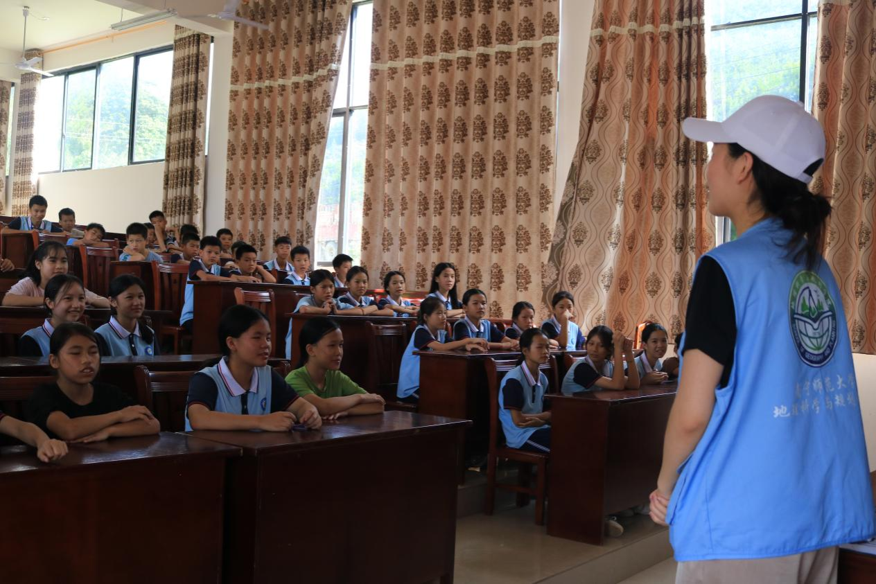 实践队队员在燕洞镇中心小学为当地儿童开展天文科普课。课程通过比较学校与地球面积差异的尺度,同时介绍了地球在宇宙中的位置以及其自转和公转的情况,进一步拓展了乡村学生的视野,引导他们对宇宙的奥秘有了更深入的理解和兴趣。